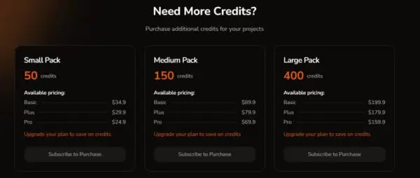 - לאחר ההרשמה, ניתן לבחור אחת מתוכניות המנוי (Basic/Plus/Pro) ולרכוש חבילות קרדיטים בהתאם לצורך.